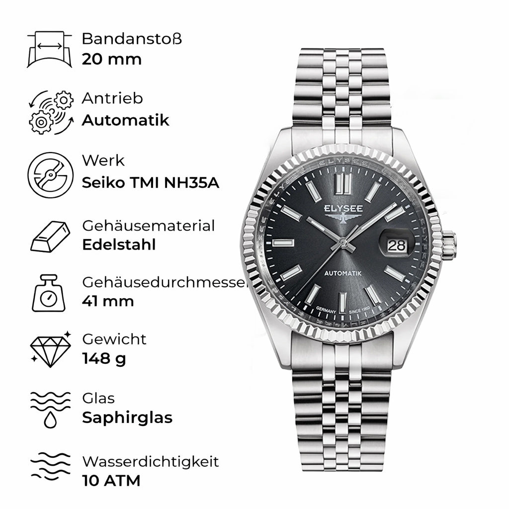 Gemeinsam mit unseren Uhrmachern und Entwicklern haben wir daraus eine Uhr geschaffen, die Design, Technik und Preis perfekt vereint. Angetrieben von einem Seiko TMI Automatikwerk mit Glasboden, geschützt durch kratzfestes Saphirglas und gefertigt aus hochwertigem 316L Edelstahl.