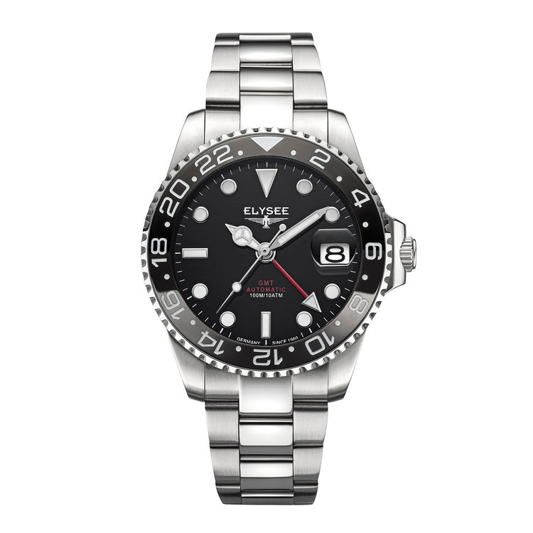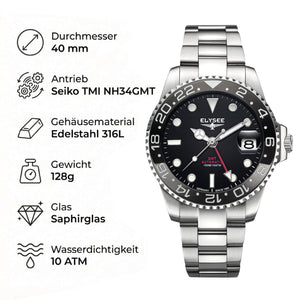 Eine Uhr, bei der Design und Mechanik eine überzeugende Einheit bilden. Vom fein gearbeiteten Zifferblatt über die markante GMT-Lünette bis hin zum massiv gearbeiteten Edelstahlarmband – jede Komponente ist perfekt aufeinander abgestimmt.